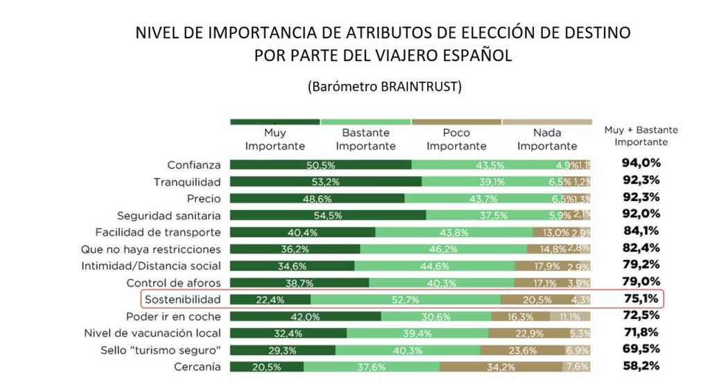 Puntos como la confianza en el destino elegido, la tranquilidad y seguridad sanitaria son los aspectos a los que el viajero da más importancia de cara a escoger dónde pasar sus vacaciones, con más de un 90% de las opiniones. No obstante, también valoran especialmente la sostenibilidad (75%), muy cerca de atributos tan importantes como la distancia social o el control de aforos. Esto da una pista del valor y consideración que el viajero otorga a destinos (y proveedores) que cuidan de su entorno natural, cultural y social, o lo que es lo mismo, la importancia cada vez mayor que tiene la sostenibilidad también en el Sector.